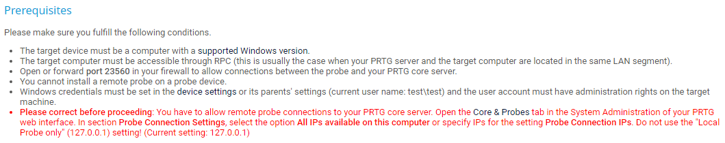 Prerequisites: Make sure that you meet the requirements listed here. If not, PRTG cannot start the installation process. Open requirements are highlighted in red.
