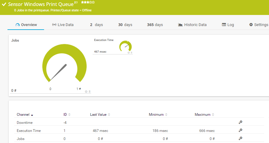 You can use this sensor to monitor all print queues on your Windows print server and to retrieve information about all available jobs that are in the queue longer than defined.